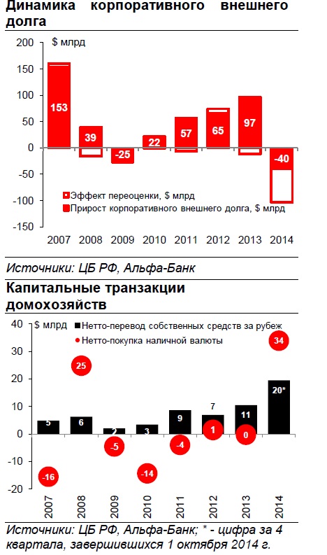 Из-за ослабления рубля на 40% в 2014 г. импорт в 2015 г. сократится на 40-50%. Это означает, что профицит текущего счета в этом году будет не ниже прошлогодних $57 млрд, что достаточно, чтобы профинансировать погашение корпоративного внешнего долга – $50 млрд, по нашей оценке. Однако капитальный счет остается под угрозой. Только в 2014 г. домохозяйства перевили за границу $20 млрд, что говорит об ослаблении доверия у населения. Если правительство не решит этой проблемы, из-за высокого чистого оттока капитала рубль будет сохраняться в диапазоне 60-70 руб./$, оставаясь ниже своей справедливой стоимости, пишут в своем аналитическом обзоре главн